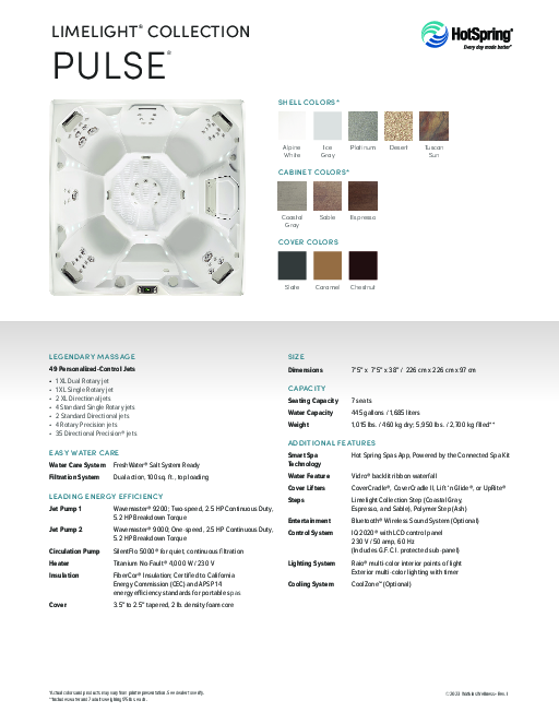 Limelight Collection spas feature an Energy Smart™ System to reduce energy consumption. You can have peace of mind knowing that your spa will be hot and ready when you are, while keeping energy costs low.